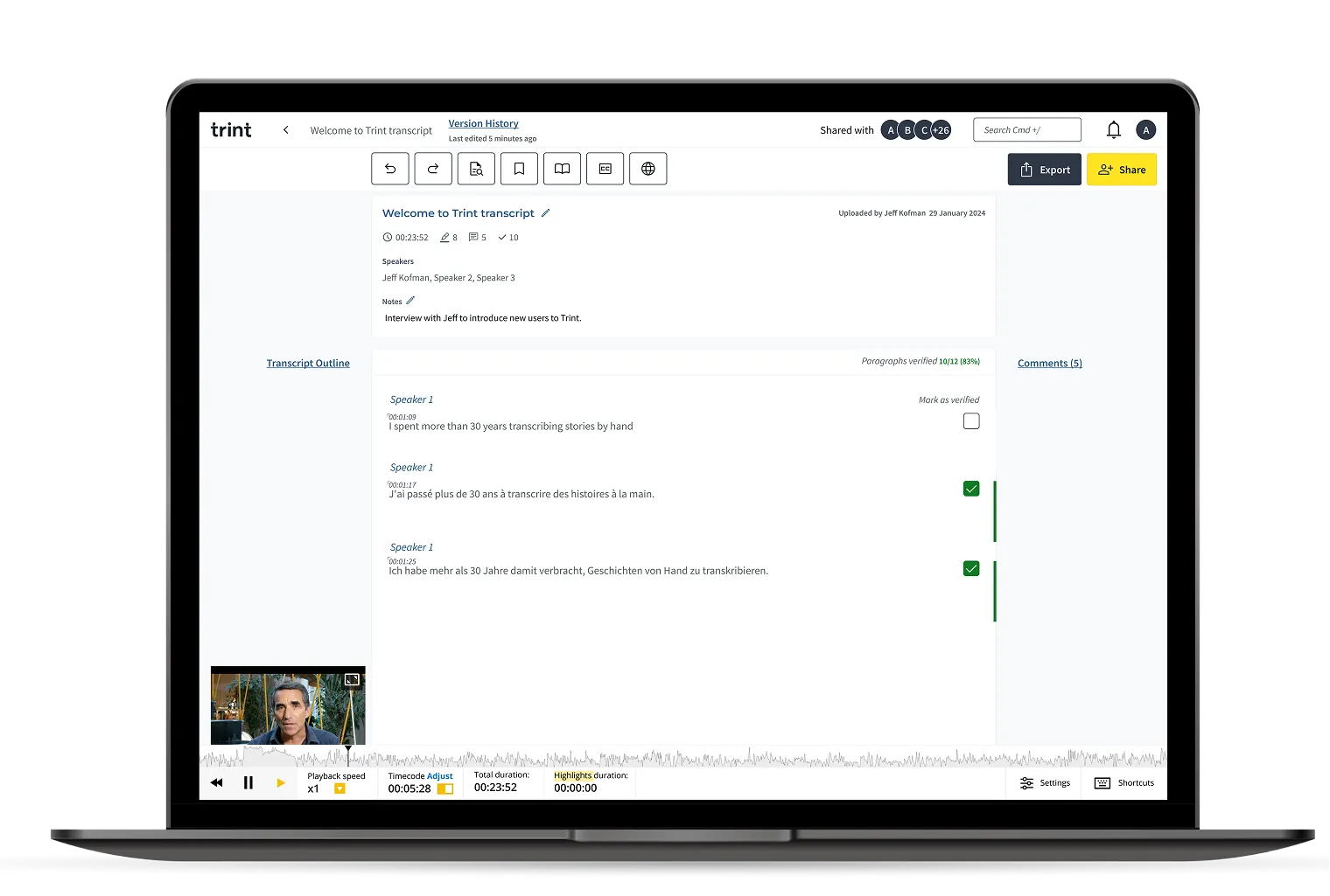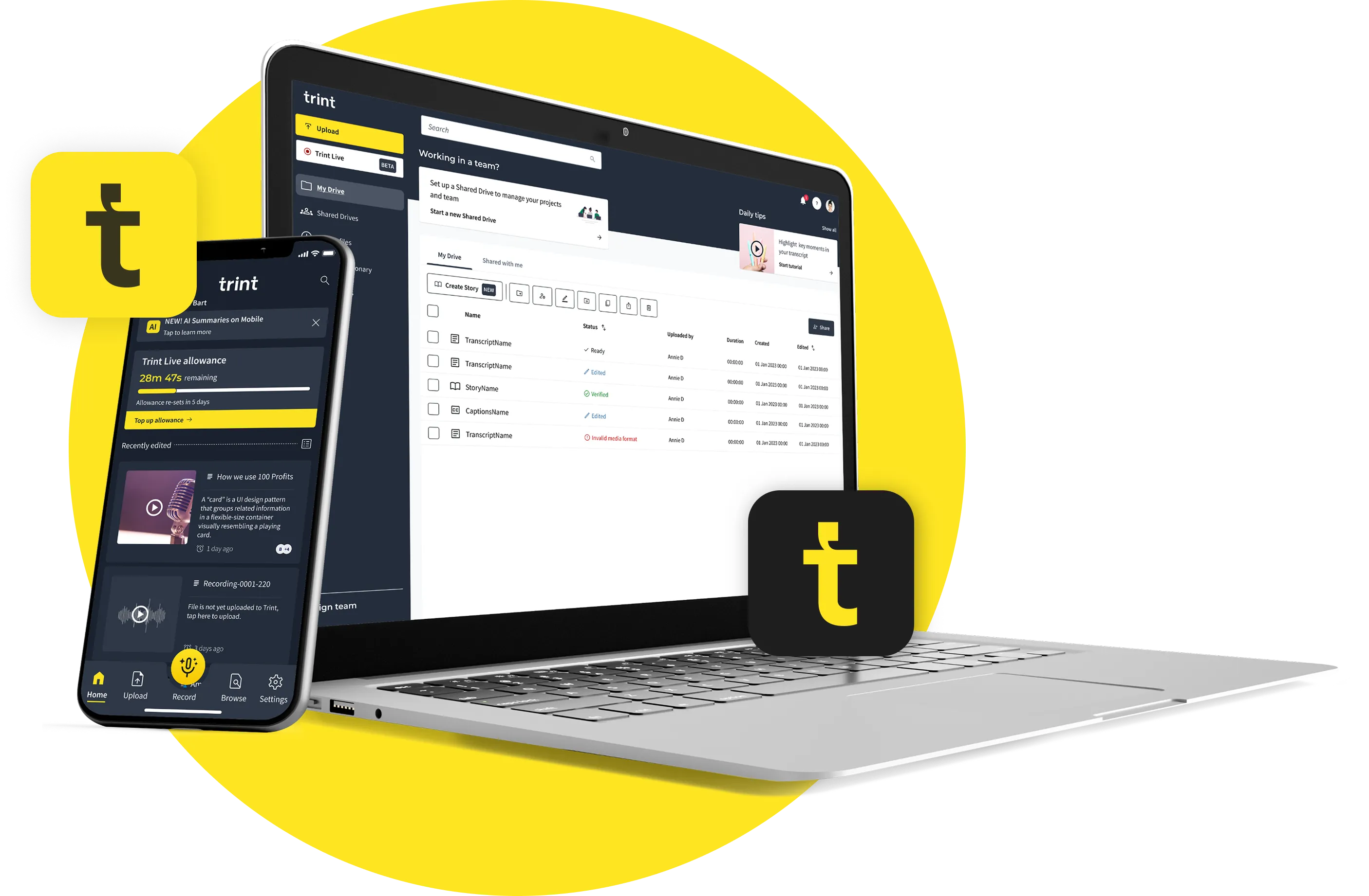 Our free-to-download desktop and mobile apps are available to Trint licence holders to help transcribe live, edit or summarize transcripts, collaborate, translate, and even organize key quotes - whether you’re on location, at the office or at home.