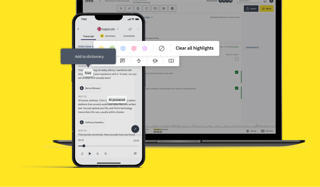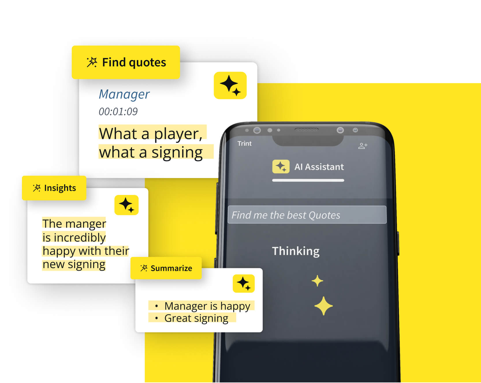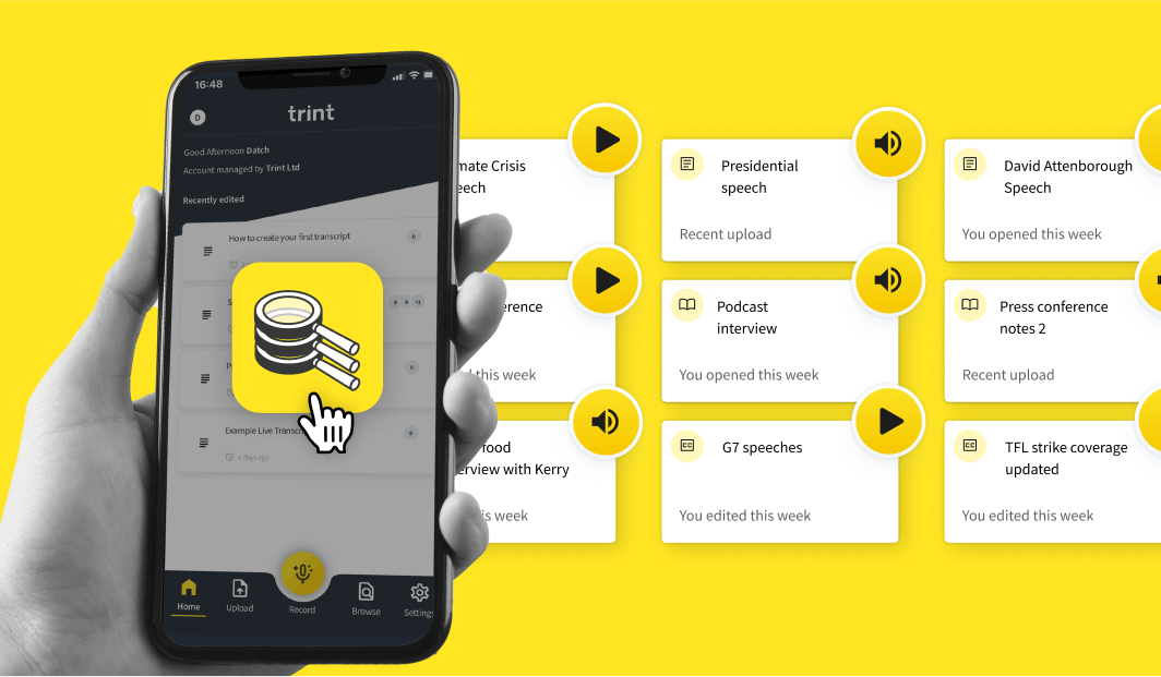 Avec les applications iOS et Android de Trint, vous pouvez capturer du son et le transcrire en direct où que vous soyez. Vous pouvez également charger des fichiers depuis votre téléphone et lire les transcriptions pour consulter le texte et partager vos idées, même en déplacement.